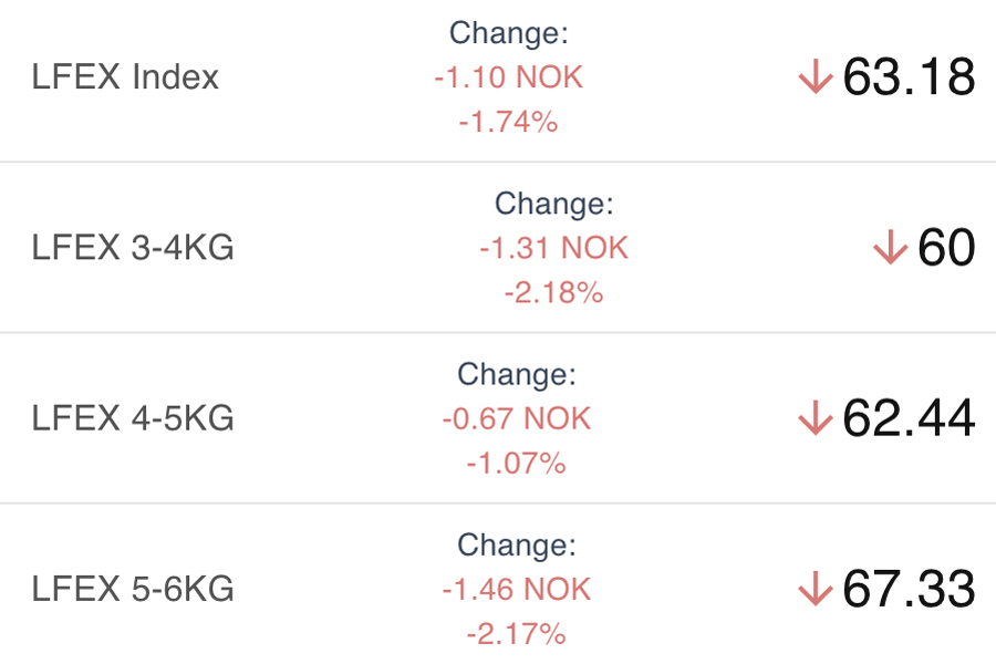 Indications this week see the index opening around the 62.5 NOK level which is down around 0.75 of a NOK from Thursday closing levels. Again, a lot of small fish available and European demand seems there or there abouts on Friday. Bigger sizes bigger prices again. Spreads between 3/4s to 5/6s around 8.5 NOK.