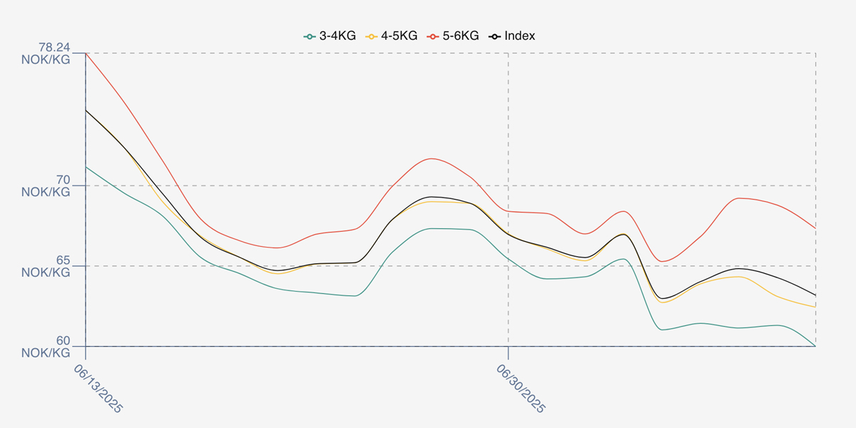 This week and size mattered. Friday sentiment was not strong for pricing and this was reflected in the continued price weakness, down a further 0.8 NOK / 1.25% at 62.98. A lot more smaller fish saw the spread 3-4s to 5-6s increase to 5 NOK. Monday saw the index level pop up a NOK, small fish were flat and larger sizes dragged the index up. Tuesday saw 64.84, the peak for the week, and smaller sizes remained flat while the 5/6s continued to increase with an 8 NOK spread opening up. Wednesday smaller sizes flat again, while 5/6 just off a little reflected in the overall 64.28 level. The index level for week ended over all down at 63.18 as all sizes fell.