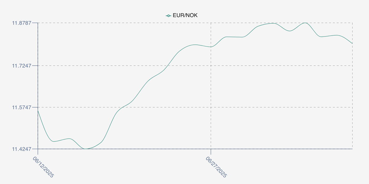 The LFEX Norwegian Exporters Index for Week 28 2025 ended the week DOWN -0.60 NOK / -0.94% to stand at 63.18 NOK (in EUR terms 5.35 / -0.02 / -0.35%) FCA Oslo Week ending Thursday vs previous Thursday.