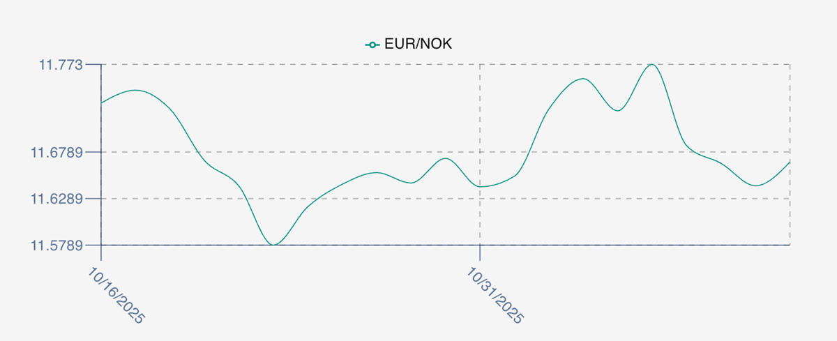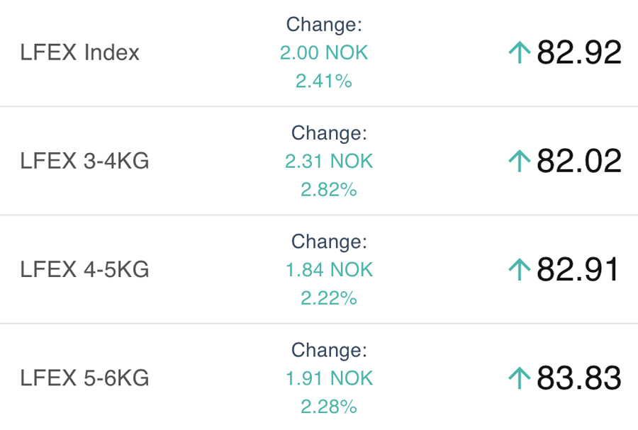 The LFEX Norwegian Exporters Index for Week 46 2025 ended the week UP +5.6 NOK / +7.24% to stand at 82.92 NOK (in EUR terms 7.11 / +0.51 / +7.70%) FCA Oslo Week ending Thursday vs previous Thursday.