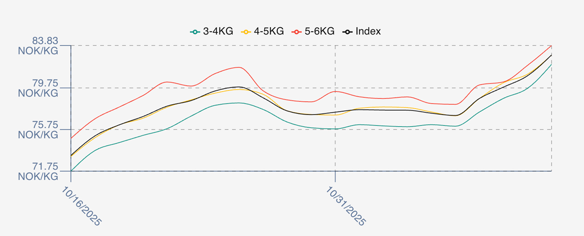Upwards price momentum this week. Pricing remained stable for the beginning of the week, in fact showing a small decline on open at 77.10 off around 0.28% on what was a pretty flat prior week. This transpired to be the low of the week and anyone buying early doors would have done well. The flat sentiment didn’t last and prices picked up, over 1.5NOK on Monday to 78.74, 1.2 NOK stronger on Tuesday as prices increased and 4/5s gapping up to near the 5/6s. Wednesday saw a NOK more on the index level as prices became more normally spread, and Thursday end of the week ran out a further 2 NOK and the biggest 1 day jump in the week. Big fish 6+ where plentiful while 3-6s came up a short with lack of fish pushing up pricing.