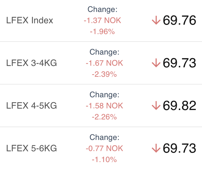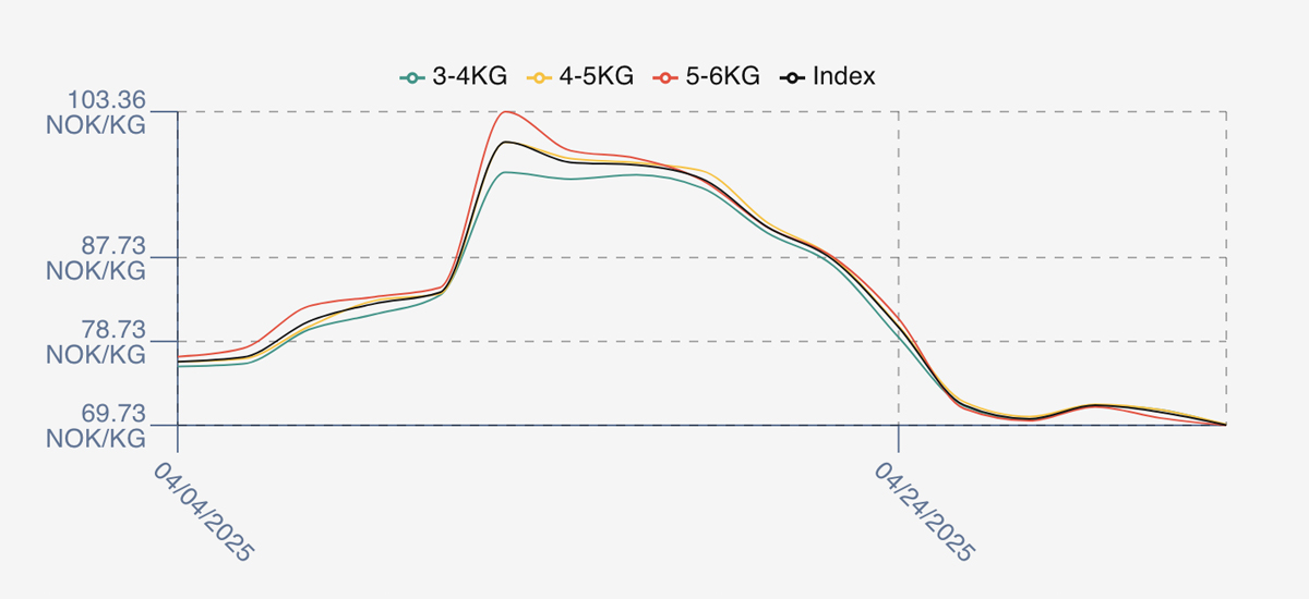Indications this week see the index opening around 69.5 NOK as offered prices come down another couple of NOK since yesterday and spreads remain tight. There continues to be a lot of quality fish coming through. US tariffs have meant and a refocus to business into Europe and Asia. Algae has meant additional slaughter from a couple of farms in the north adding to volumes…and Barcelona expo starts next week…so a complicated picture to juggle.