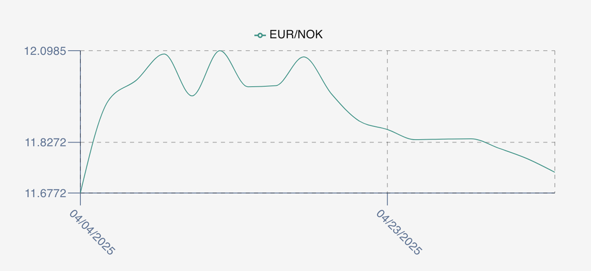 The LFEX Norwegian Exporters Index for Week 18 2025 ended the week DOWN -9.11 NOK / -11.35% to stand at 71.13 NOK (in EUR terms 6.04 / -0.74 / -10.94%) FCA Oslo Week ending Wednesday vs previous Thursday.