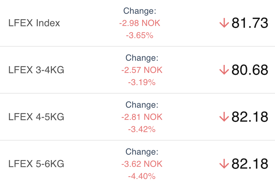 Early indications around the offered indicative level of 80.4 NOK for the index which would put it continuing its downward trend and off a further 1.25 / 1.5 NOK from Thursday. A lot of unsold fish available today which is having an effect of complicating pricing for next week.