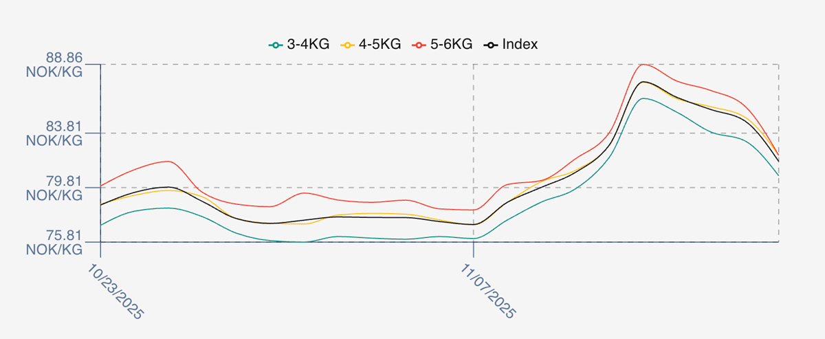 The LFEX Norwegian Exporters Index for Week 48 2024 ended the week down -1.15 NOK / -1.32% to stand at 86.13 NOK (in EUR terms 7.39 / -0.14 / -1.83%) FCA Oslo. The NOK rate ended up at 11.66 to the Euro. The Fish Pool future November was reported up Thursday to Thursday 0.50 NOK / +0.63% at 80.5 NOK with Dec showing 86.50 up 2.5 NOK.