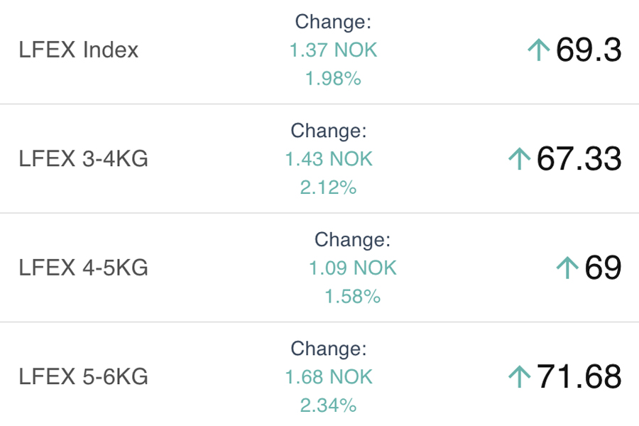 The LFEX Norwegian Exporters Index for Week 26 2025 ended the week UP +3.75 NOK / +5.72% to stand at 69.30 NOK (in EUR terms 5.87 / +0.20 / +3.48%) FCA Oslo Week ending Thursday vs previous Thursday.