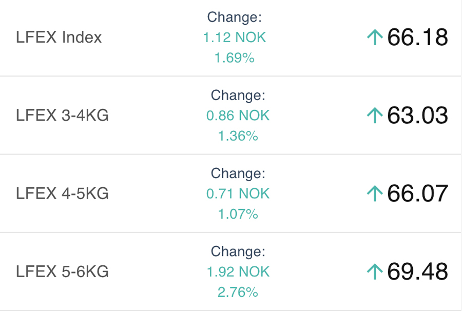Indications this week see the index will be a little further up from last weeks close with an indication of indicative offered levels around 66 NOK. Bigger sizes continue to have more strength. Lots of volume going through and buyers have been using the low prices to freeze inventory. To be seen how this continues as prices have risen in the last 3 days of trading.