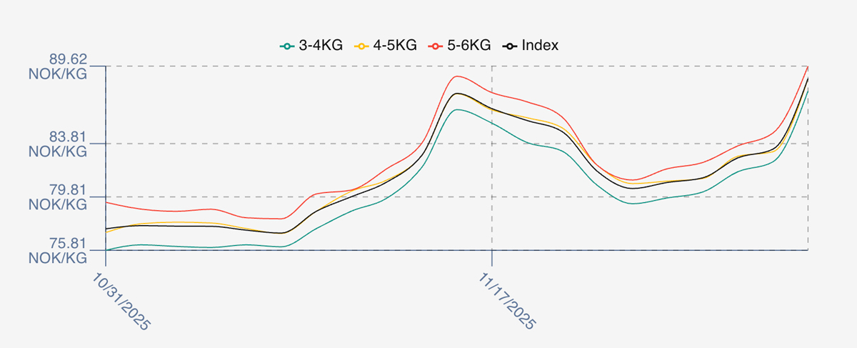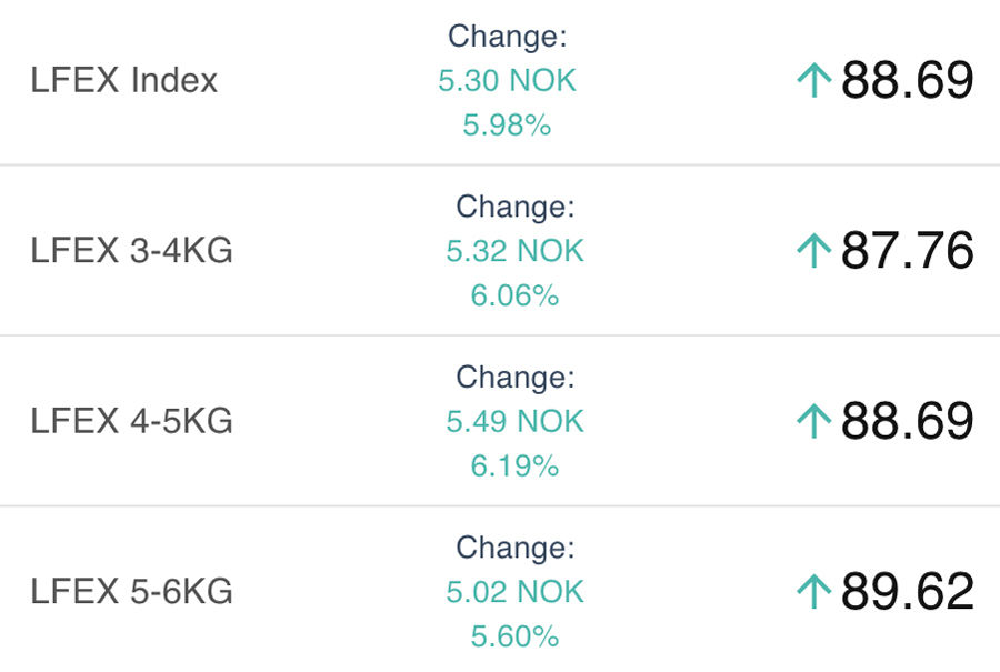 Spreads on the index sat at 1.8 NOK on Friday as 4/5s and 5/6s remained close in pricing. Spread between the 3 weight classes became more balance by the end of the week, with 2.2 NOK between the smallest and largest fish in the index.