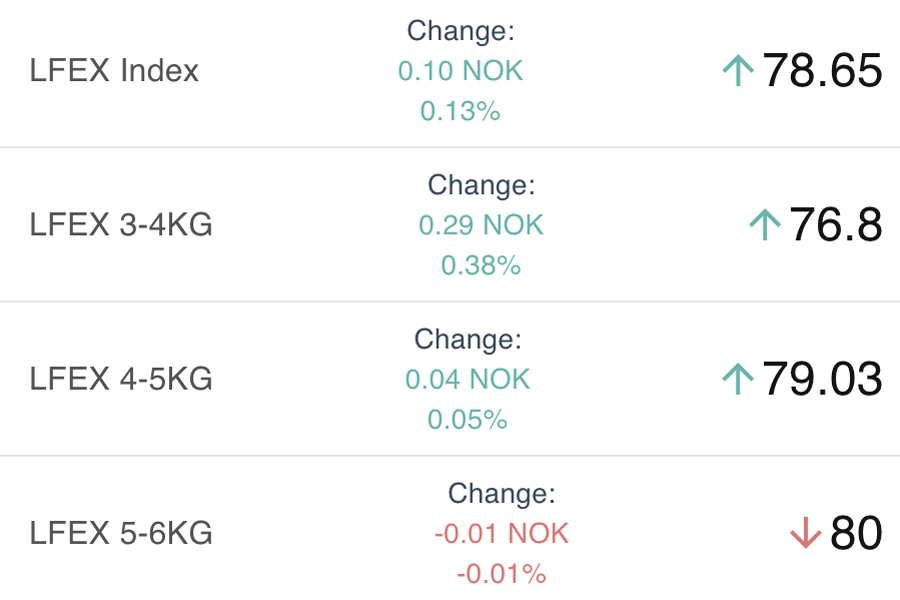 The LFEX Norwegian Exporters Index for Week 23 2025 ended the week UP +12.19 NOK / +18.34% to stand at 78.65 NOK (in EUR terms 6.83 / +1.05 / +18.24%) FCA Oslo Week ending Thursday vs previous Thursday.