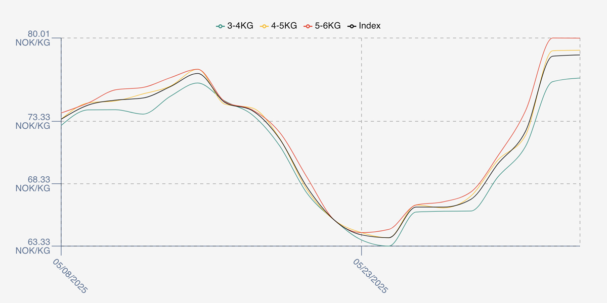 Indications this week see the index opening around 82.5 NOK level as offered prices continue their Whitsun 4 day week climb. Volumes remain good at the beginning of the trading week as sellers push prices, and there is a significant spread of prices in the market currently. Concerns that the price has risen too quickly, which could come undone, especially if the bigger players don’t play.