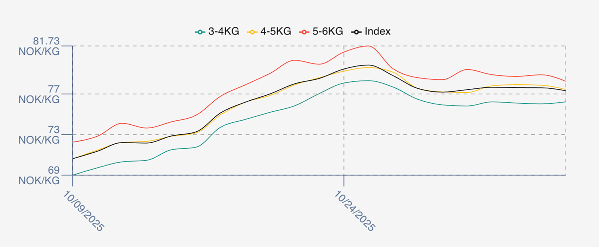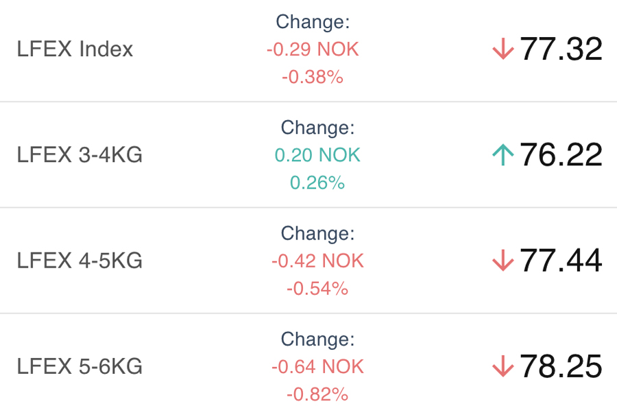 Early indications around the offered indicative level of 77.1 NOK for the index which would put it just below Thursdays close. Fish remained widely available from last week, but it looks like there will be less fish to sell this week. The market is definitely quieter this Friday. Larger fish 6+ size being plentiful.