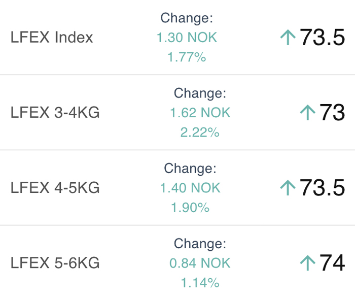 The LFEX Norwegian Exporters Index for Week 19 2025 ended the week UP +2.37 NOK / +3.33% to stand at 73.5 NOK (in EUR terms 6.29 / +0.25 / +4.13%) FCA Oslo Week ending Thursday vs previous Wednesday.