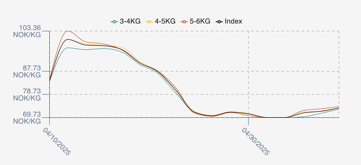 A difficult week to get a good read on prices. Friday opened the trading week offered at 69.76 a further fall from the close on the Wednesday (1st May Thursday being a holiday). As noted last week there was a combination of pressures on pricing – a lot of quality fish coming through, US tariffs have meant a refocus to business into Europe and Asia. Algae has meant additional slaughter from a couple of farms in the north adding to volumes and Barcelona expo created a complicated price picture. With many travelling at the expo pricing remained flat on the Monday, and reality there was little pricing transparency. We saw a gentle rise in pricing over the week to a close at 73.5.