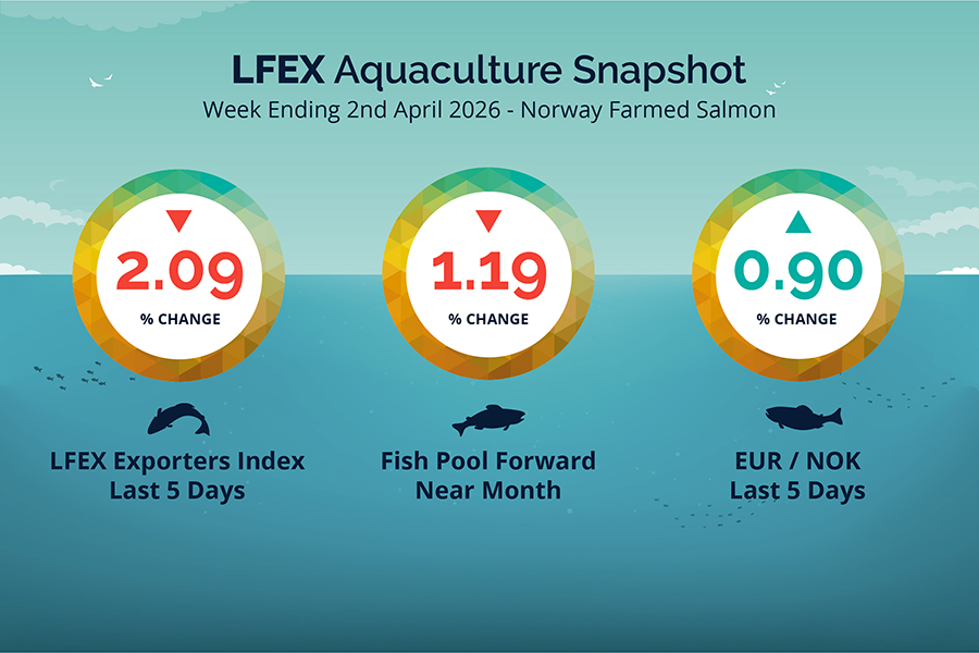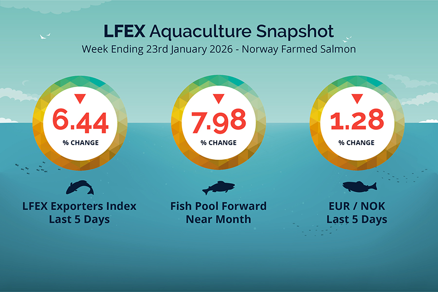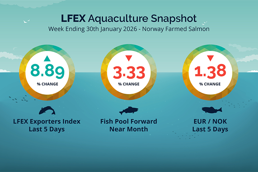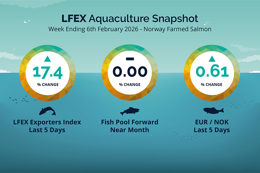 The LFEX Norwegian Exporters Index for Week 5 2026 ended the week UP +6.85 NOK / +8.89% to stand at 83.94 NOK (in EUR terms 7.36 / +0.69 / +10.41%) FCA Oslo Week ending Thursday to Thursday (yesterday).