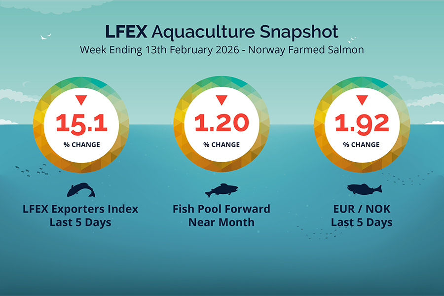 The LFEX Norwegian Exporters Index for Week 6 2026 ended the week UP +14.63 NOK / +17.43% to stand at 98.57 NOK (in EUR terms 8.59 / +1.23 / +16.71%) FCA Oslo Week ending Thursday to Thursday (yesterday).
