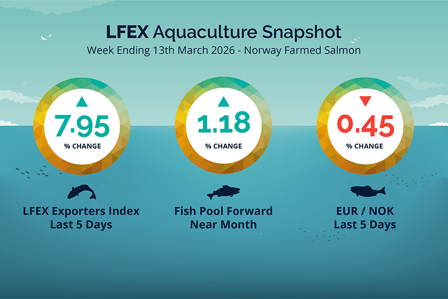 The LFEX Norwegian Exporters Index for Week 11 2026 ended the week UP +7.28 NOK / +7.95% to stand at 98.86 NOK (in EUR terms 8.85 / +0.69 / +8.43%) FCA Oslo Week ending Thursday to Thursday (yesterday).