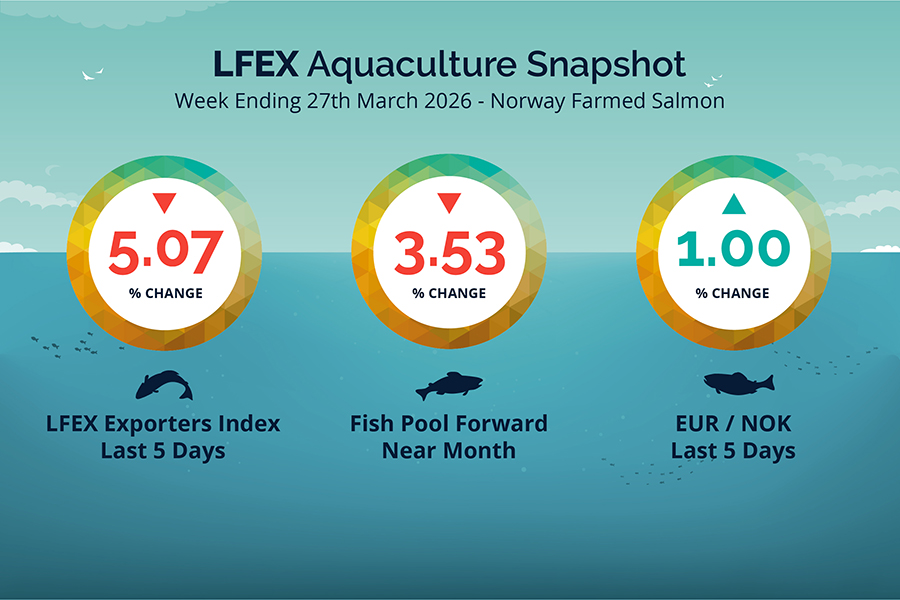 The LFEX Norwegian Exporters Index for Week 13 2026 ended the week DOWN -4.80 NOK / -5.07% to stand at 89.86 NOK (in EUR terms 8.09 / -0.52 / -6.01%) FCA Oslo Week ending Thursday to Thursday (yesterday).