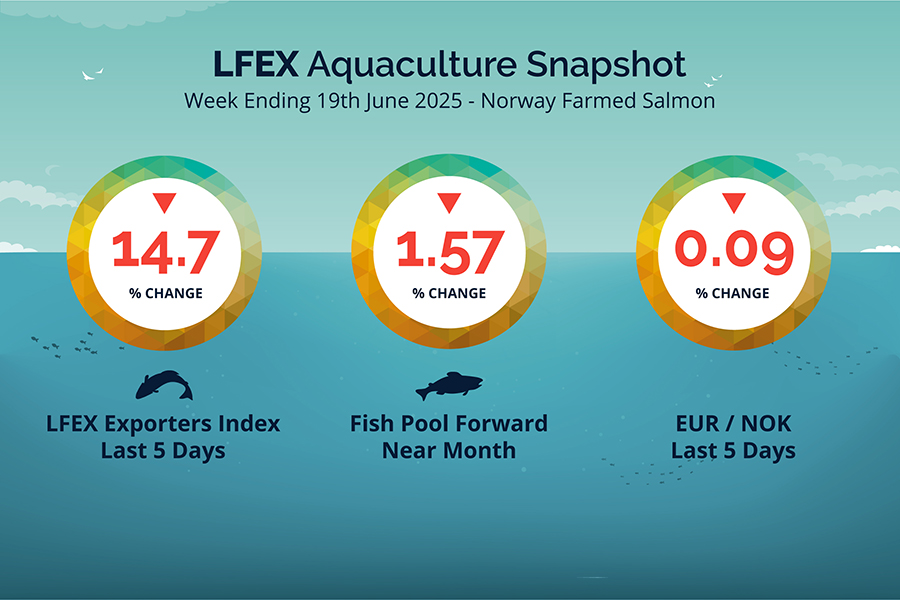 The LFEX Norwegian Exporters Index for Week 25 2025 ended the week DOWN -11.30 NOK / -14.70% to stand at 65.55 NOK (in EUR terms 5.68 / -0.97 / -14.63%) FCA Oslo Week ending Thursday vs previous Thursday.