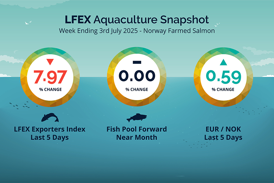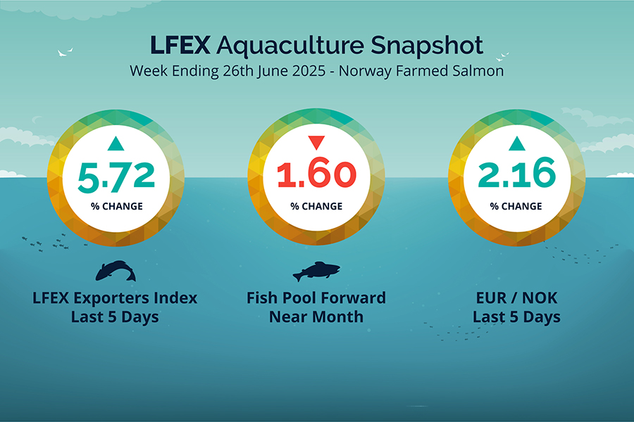 The LFEX Norwegian Exporters Index for Week 26 2025 ended the week UP +3.75 NOK / +5.72% to stand at 69.30 NOK (in EUR terms 5.87 / +0.20 / +3.48%) FCA Oslo Week ending Thursday vs previous Thursday.