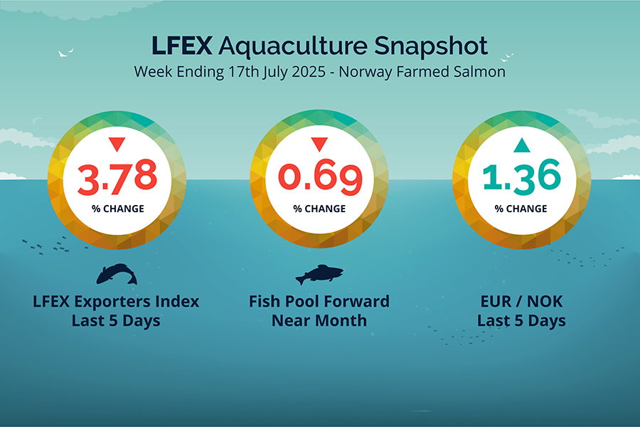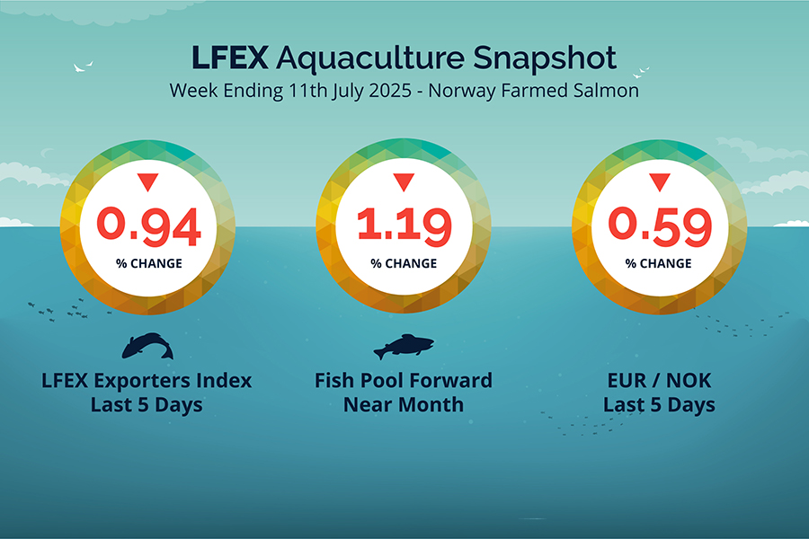 The LFEX Norwegian Exporters Index for Week 28 2025 ended the week DOWN -0.60 NOK / -0.94% to stand at 63.18 NOK (in EUR terms 5.35 / -0.02 / -0.35%) FCA Oslo Week ending Thursday vs previous Thursday.
