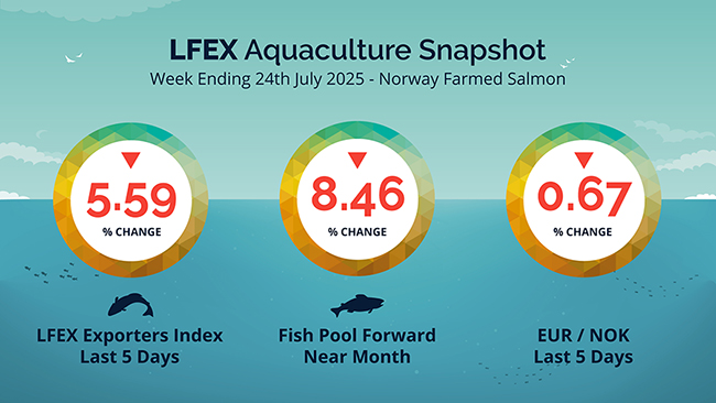 The LFEX Norwegian Exporters Index for Week 30 2025 ended the week DOWN -3.40 NOK / -5.59% to stand at 57.39 NOK (in EUR terms 4.83 / -0.25 / -4.96%) FCA Oslo Week ending Thursday vs previous Thursday.