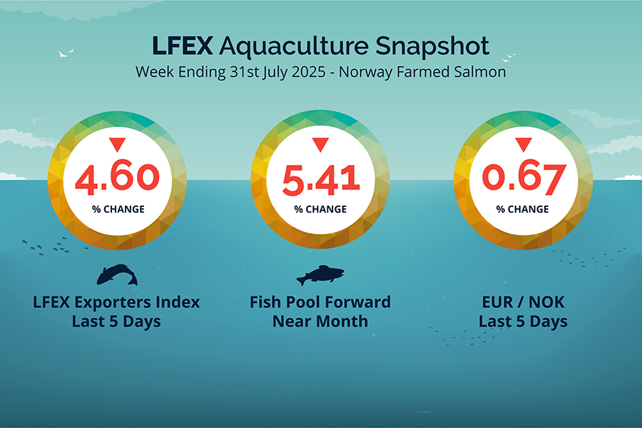 The LFEX Norwegian Exporters Index for Week 31 2025 ended the week DOWN -2.64 NOK / -4.60% to stand at 54.75 NOK (in EUR terms 4.64 / -0.19 / -3.95%) FCA Oslo Week ending Thursday vs previous Thursday.