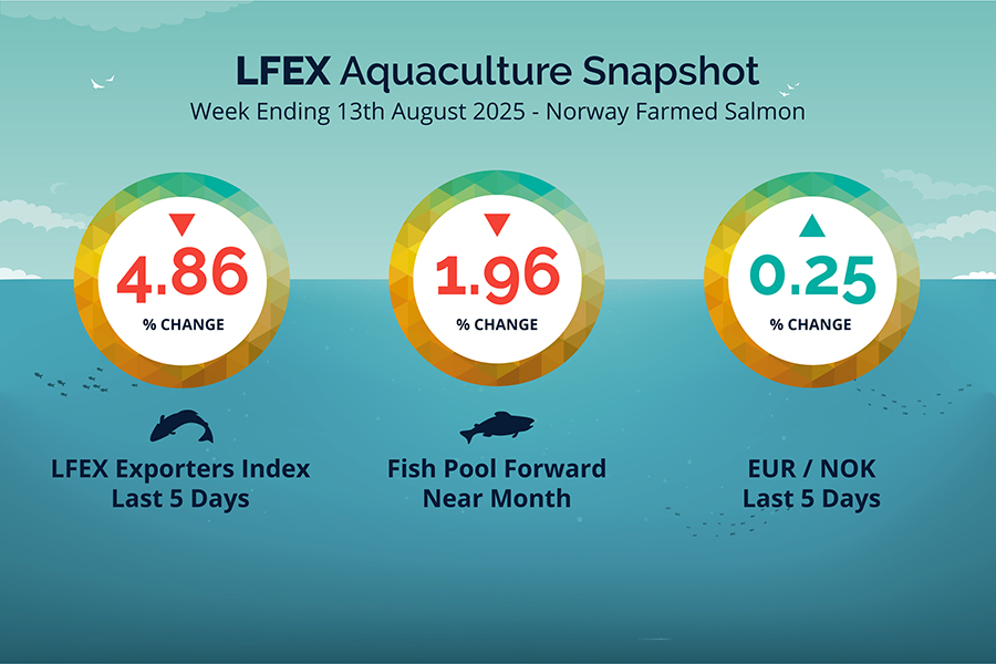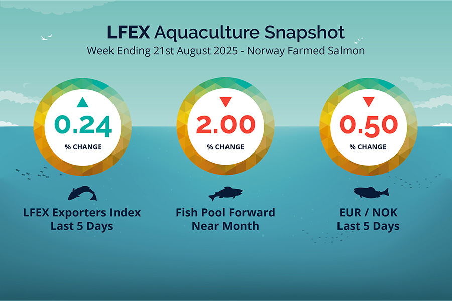 The LFEX Norwegian Exporters Index for Week 34 2025 ended the week UP +0.14 NOK / +0.24% to stand at 59.42 NOK (in EUR terms 5.01 / +0.04 / +0.74%) FCA Oslo Week ending Thursday vs previous Thursday.