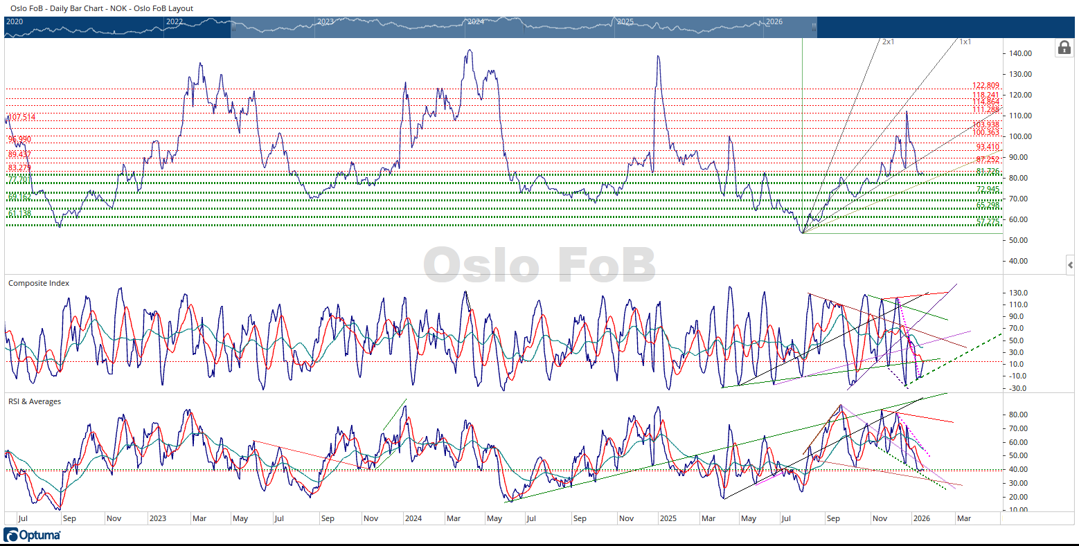 The Composite Index has moved to higher displacement vs last week. I could argue that there is bearish divergence in the Composite Index from last Tuesday’s displacement and today’s Composite Index displacement. The Composite Index was at a lower displacement last Tuesday vs today and today’s Oslo FoB Index price is below last Tuesday’s closing price. The Composite Index is more overbought at lower prices. This is bearish activity. At this time, I wouldn’t assign a high probability to this observation, but it is there. The Composite Index is testing the underside of its fast-moving average which can provide resistance. The Composite Index does have some history of making displacement changes near its current displacement. I’ve mentioned this many times in the last five years, when trendlines made from divergence signals cross, there is an acceleration or change in trend in the security. The red and black trendlines cross on Friday January 16, 2026, plus or minus a day or two. The green and purple trendlines cross around Wednesday January 21, 2026, plus or minus a day or two. This implies we should see some pick up in price movement in the coming week.