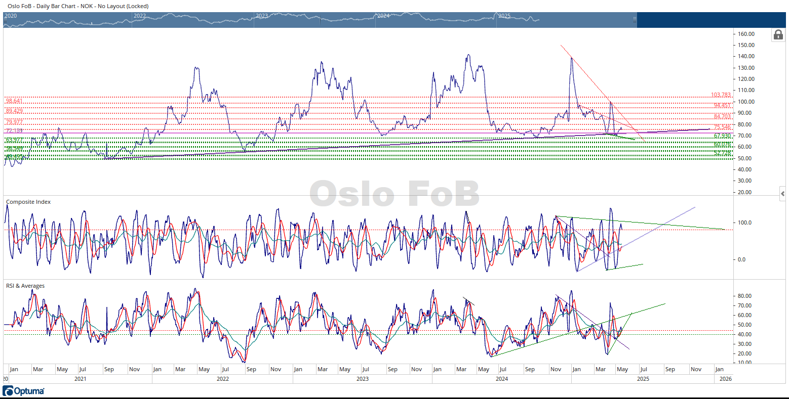 In summary, there are some bullish and bearish developments in the Oslo FoB Index. The bullish view is this price area has launched some significant rallies within the available price history. The indicators can rally from their current displacements. The RSI has a decent history of giving good buy signals when the RSI moving averages experience a positive crossover. This signal is less reliable during bear markets. The bearish view is, within the available price history, that during this time of the calendar year, the price of the Oslo FoB Index is usually experiencing a bear market. The Composite Index rallied more than the corresponding move up in the Oslo FoB Index. The Composite Index is near the upper end of its displacement range. The first sign of trouble will be when the RSI breaks below the green trendline.