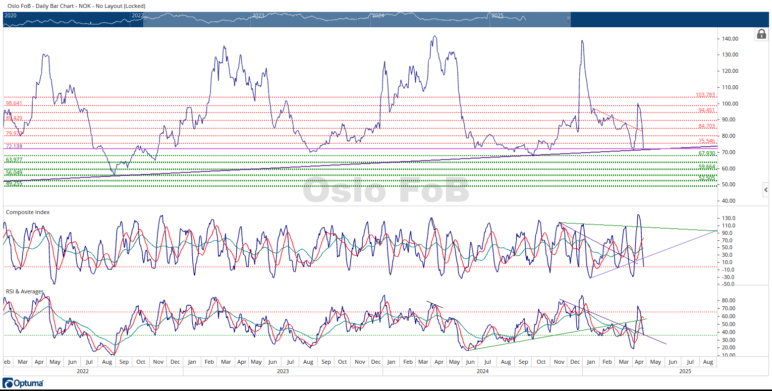 In summary, the Oslo FoB Index appears to have put in its seasonal price highs. The Oslo FoB Index is testing a support zone that was derived from three unrelated techniques. This suggests there should be strong price support nearby. The indicators are testing prior displacement lows that have produced rallies in the indicator. This supports the view that the Oslo FoB Index can rebound to higher prices. Can the Oslo FoB Index continue moving to lower prices? Absolutely. Supporting this view, I do not see any bullish divergence signals in the indicators suggesting that the current swing down is losing strength.