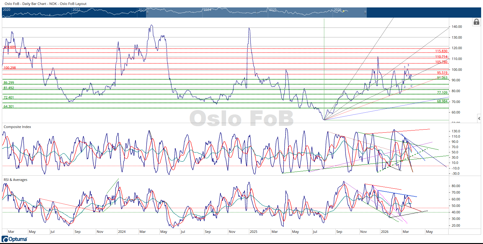 The Composite Index has fallen to the lower end of its displacement range. It can certainly keep going down to lower displacements and at the same time, the Oslo FoB Index has used this displacement twice as support in 2026. The Composite Index appears to be riding the brown trend line down. I changed the colour of this trendline vs last week’s update to help make the trendline easier to see for the reader. This brown downward sloping trendline is displaying a bullish signal for the Oslo FoB Index. Notice that the moving averages for both the RSI and the Composite index are rapidly moving to a negative displacement. There are two different trendlines displayed on the Composite Index pane that are crossing on Friday March 27th, 2026, plus or minus a day or two. These intersections usually correspond with a change or acceleration in price of the Oslo FoB Index.