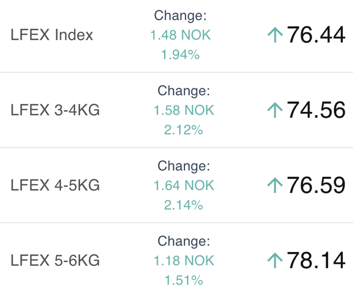 The LFEX Norwegian Exporters Index for Week 38 2023 was up +2.56%, +1.91 NOK to stand at 76.44 NOK (approximately 6.64 EUR) FCA Oslo Week ending Thursday vs previous Thursday.