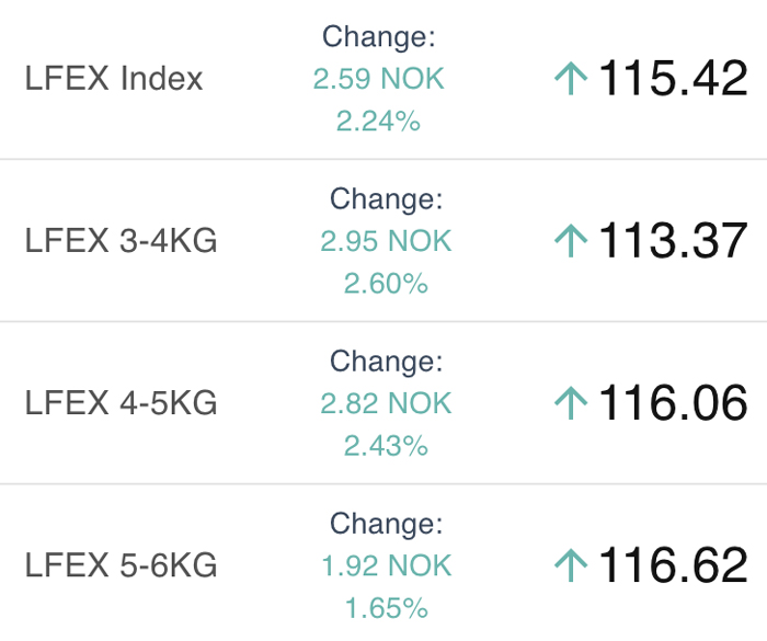 The LFEX Norwegian Exporters Index for Week 12 2024 ended the week up + 7.56%, +8.11 NOK to stand at 115.42 NOK (in EUR terms 10.01 / +0.65 / + 6.9%) FCA Oslo Week ending Thursday vs previous Thursday.