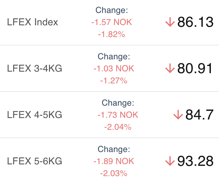 The LFEX Norwegian Exporters Index for Week 48 2024 ended the week down -1.15 NOK / -1.32% to stand at 86.13 NOK (in EUR terms 7.39 / -0.14 / -1.83%) FCA Oslo Week ending Thursday vs previous Thursday.