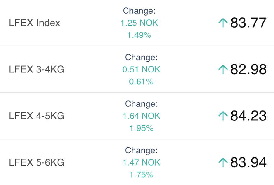 The LFEX Norwegian Exporters Index for Week 5 2026 ended the week UP +6.85 NOK / +8.89% to stand at 83.94 NOK (in EUR terms 7.36 / +0.69 / +10.41%) FCA Oslo Week ending Thursday to Thursday (yesterday).