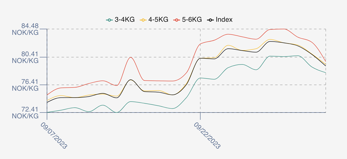 The LFEX Norwegian Exporters Index for Week 40 2023 was down -2.47%, -2.00 NOK to stand at 79.13 NOK (approximately 6.83 EUR) FCA Oslo Week ending Thursday vs previous Thursday.