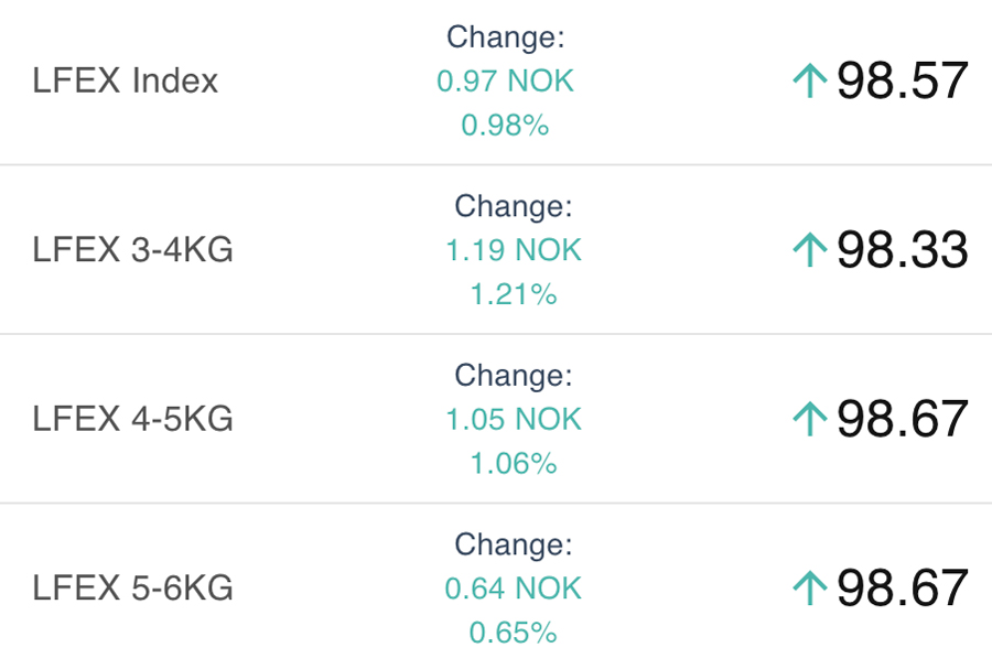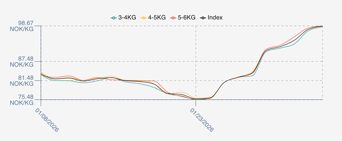 Early indications showing prices around the 99 NOK level for the index as we head into the new week. That puts us UP marginally from the close yesterday of 98.5, and 8 – 9 NOK higher since this time last Friday. Prices continued up on the strength of the upcoming Chinese New Year with good volumes heading East, large fish being sold in that direction which has helped. This will end next week and generally the feeling is that prices will probably soften a little.