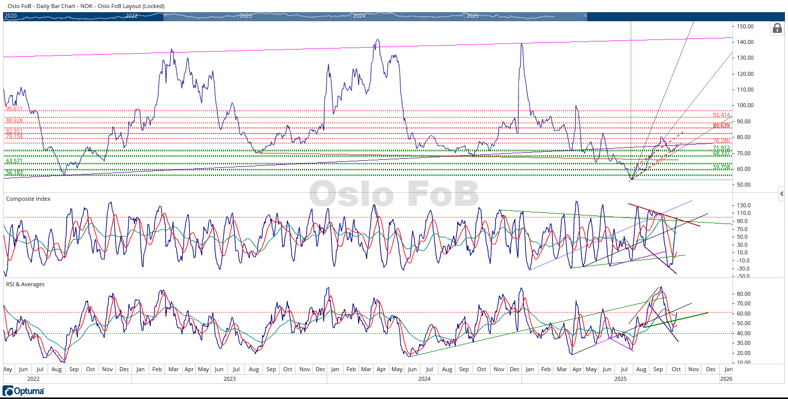 The Oslo FoB Index bounced off the lower red dashed trendline that connects the first two price lows from July and August 2025. The Index is now testing the underside of the purple trendline that connects the 2021, 2022 and 2024 seasonal price lows. The 76.28 red horizontal resistance zone is nearby.