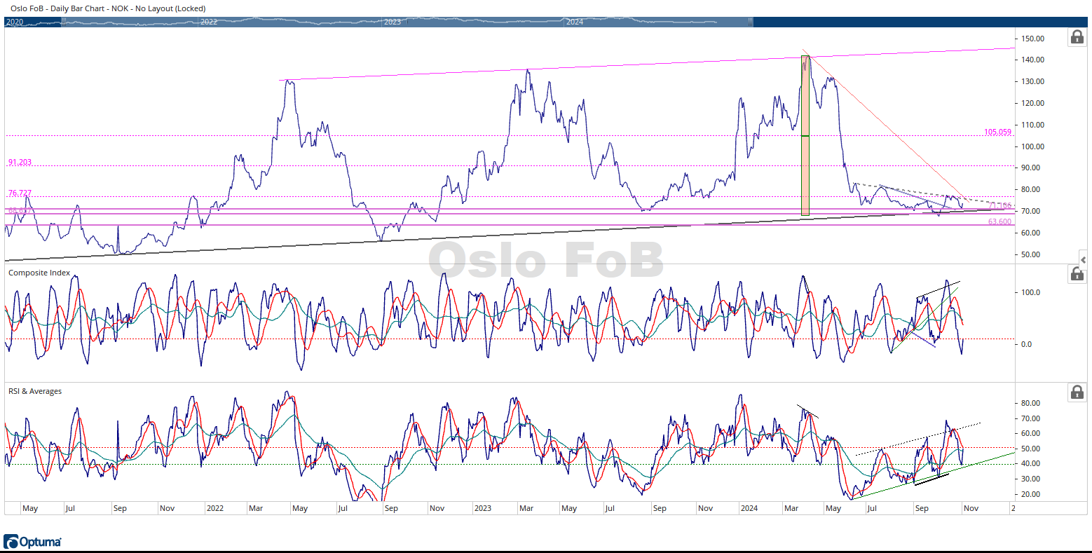 In summary, with the RSI bouncing off the displacement it has used in the past in bullish trends, the bullish divergence between the Composite Index and the RSI, and both indicators are near the lower end of their displacement ranges, I believe we are in the early stages of the start of the Oslo FoB Index seasonal rally. The troubling issue is that the 76 NOK area with the confluence of resistance will require a large amount of energy to overcome.
