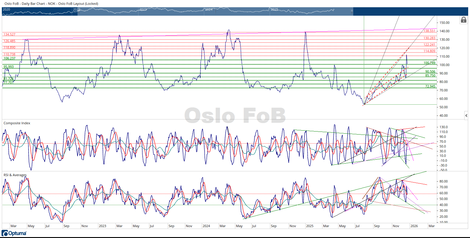 The Oslo FoB Index is testing the 100.74 NOK support zone. If this support zone doesn’t hold, the next support area is 95.99 NOK, 90.56 NOK and then 85.75 NOK. The 85.75 NOK support zone is getting down near the lower end of the uptrend channel the Oslo FoB Index has been using since late July 2025. The Oslo FoB Index is continuing to make higher price highs and higher price lows.