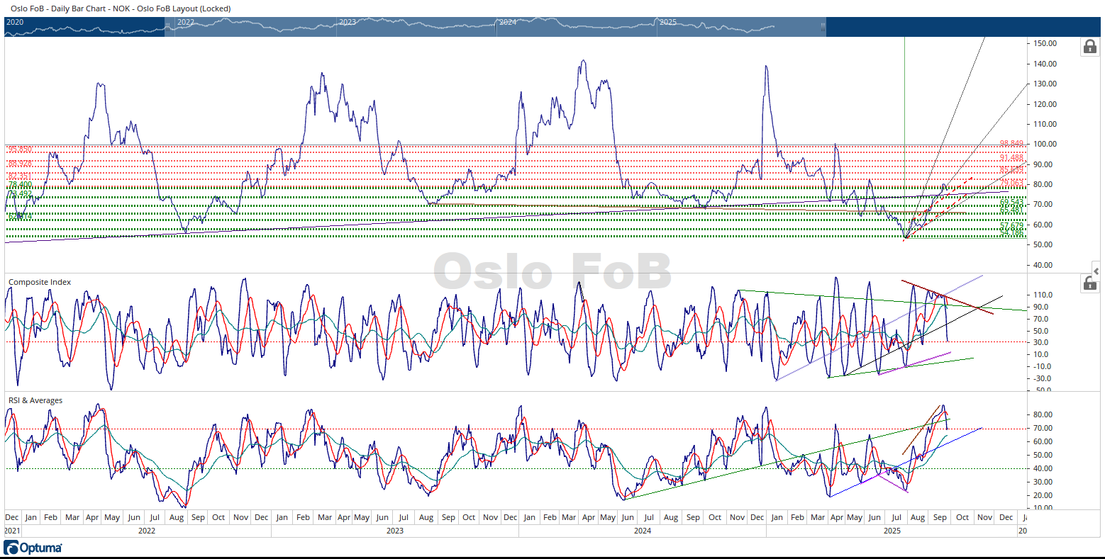 In summary, the Oslo FoB Index appears to be resting and resetting for another swing up in prices. How far will the Index pull back? The intersection of the dashed red, purple trendlines and 73.49 NOK horizontal trendlines is a strong candidate. There is a timing signal for the middle of next week. I’m not seeing any bullish or bearish divergence, suggesting that the Oslo FoB Index probably has some more work to do during this price pull back.