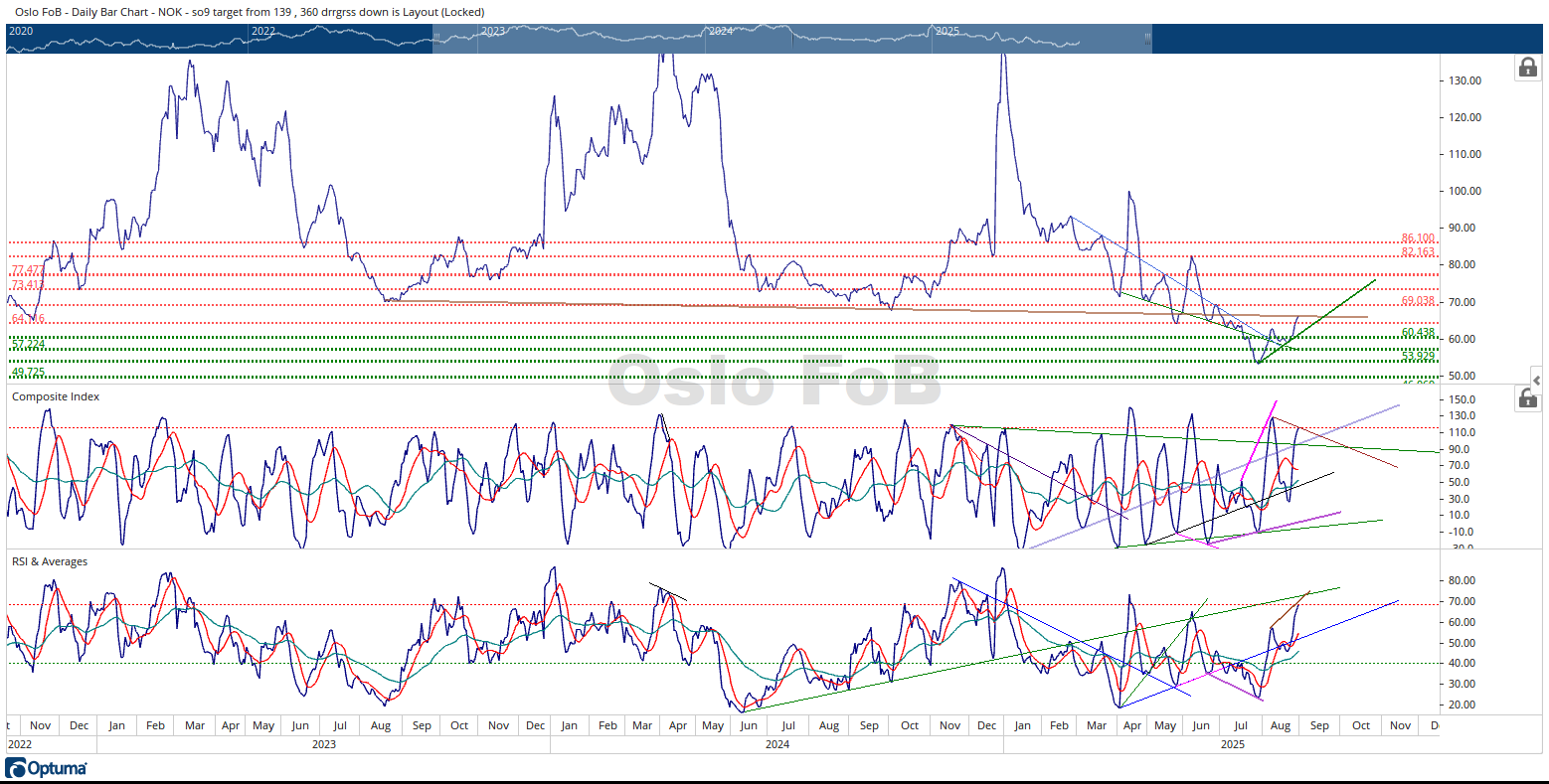 The Composite Index rallied to the higher end of its displacement range. Notice the Composite Index displacement high on August 7th, 2025. The Composite Index is currently at a lower displacement than August 7th, 2025, displacement high while the Oslo FoB Index is at a higher price. The Composite Index is displaying bearish divergence, meaning the current swing up is losing momentum. The brown downward sloping trendline on the Composite Index should help to see the divergence. Notice this newly created brown trendline will cross the green downward sloping trendline in early Oct 2025.