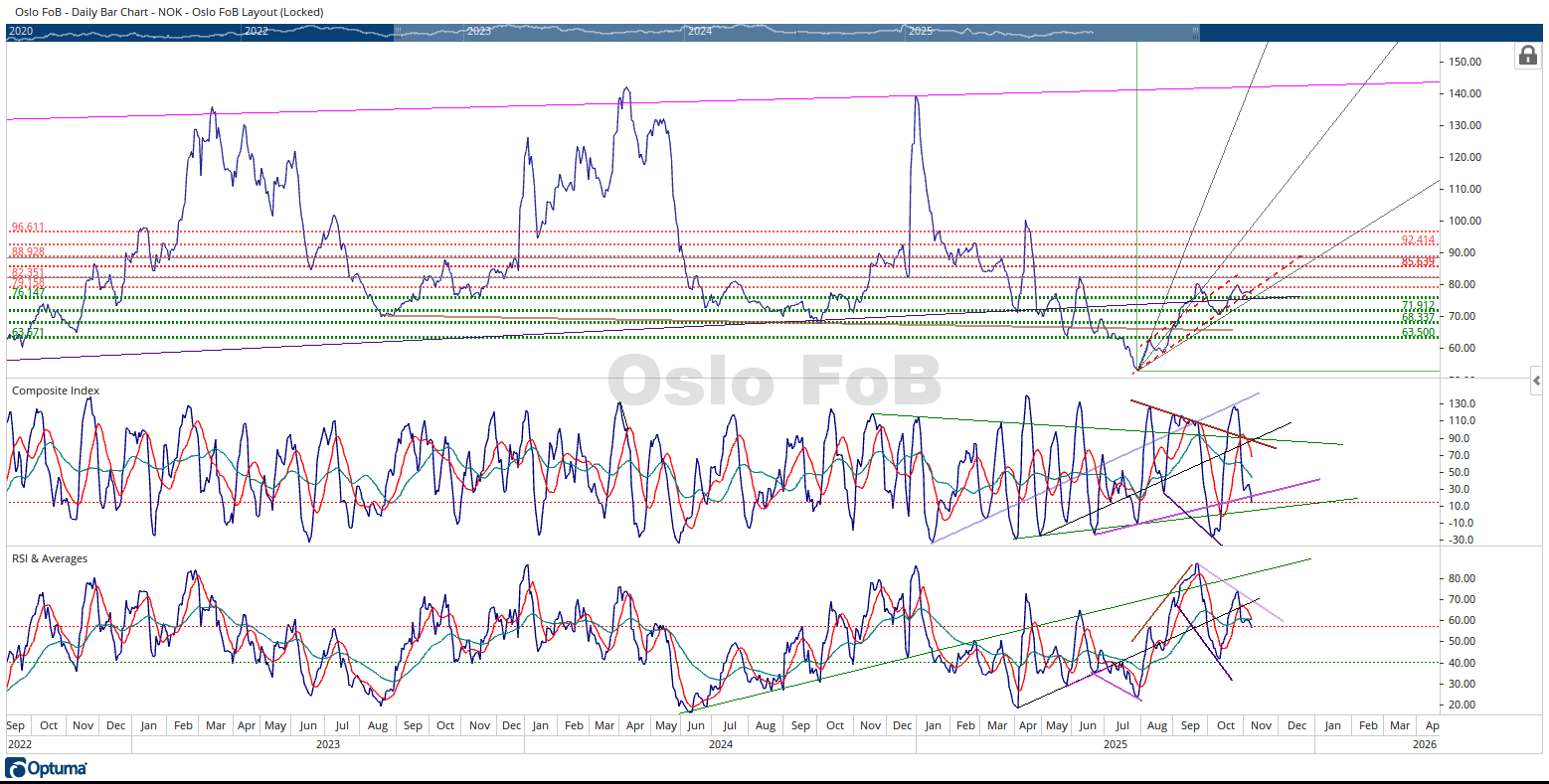 I moved the lower red dashed upward sloping trendline to catch the price lows on October 9, 2025. I then changed the upper red dashed trendline to have the same slope as the lower trendline to see how these trendlines work on the existing data. I prefer to use the three upward sloping black trendlines originating at the July 2025 price low for many reasons that are too involved to explore in this report. The Oslo FoB Index has been digesting its recent gains going sideways in price as the indicators are resetting lower. I’ve mentioned this issue several times over the years in these updates. This is bullish behaviour.